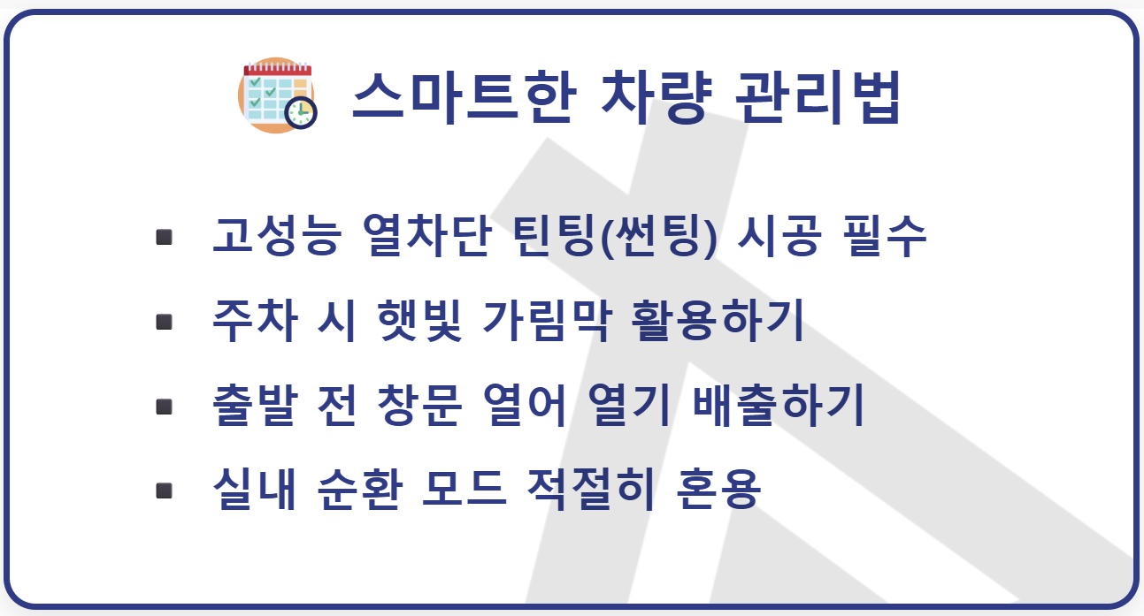 또한 여름철에는 실내 주차장을 우선적으로 이용하고, 야외 주차 시에는 창문을 아주 살짝 열어두거나 앞 유리에 가림막을 설치하는 것도 도움이 됩니다.