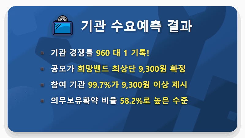 - 높은 공모가 확정: 대부분의 기관이 희망 공모가 밴드(8,000원~9,300원)의 최상단인 9,300원 이상을 제시하여, 최종 공모가가 9,300원으로 확정되었습니다.