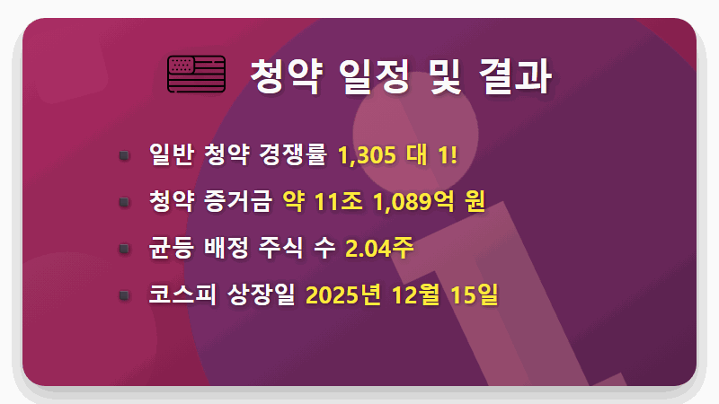 기관 투자자들의 뜨거운 관심은 일반 투자자들의 청약 열기로 고스란히 이어졌습니다. 12월 3일과 4일, 이틀간 진행된 일반 청약에서는 무려 11조 원이 넘는 증거금이 몰리며 1,305.47대 1이라는 놀라운 최종 경쟁률을 기록했습니다.
