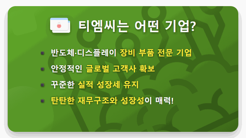 안정적인 글로벌 대기업들을 고객사로 확보하고 있어 꾸준한 실적 성장을 기록하고 있다는 점이 바로 티엠씨의 가장 큰 강점입니다. 이는 기업의 펀더멘털(기초체력)이 매우 탄탄하다는 것을 의미하며, 투자자들이 열광하는 핵심적인 이유입니다.
